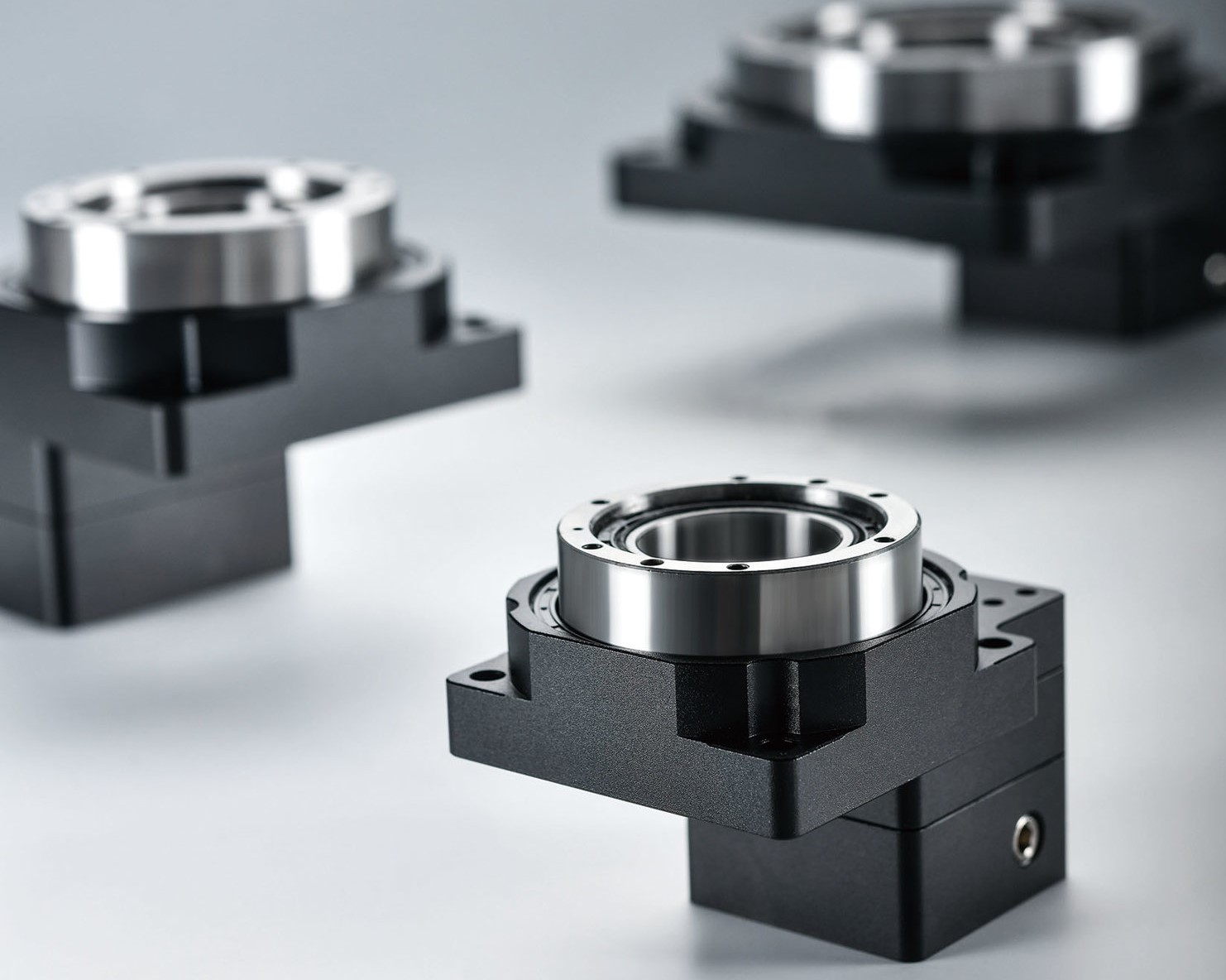 低側(cè)隙伺服旋轉(zhuǎn)平臺(tái)采用行星減速的方式來(lái)增大輸出力矩,減速比從1至1536,輸出力矩范圍較大,能夠滿足各種力矩要求的場(chǎng)合。另外通過(guò)改變齒輪中心距離的方法來(lái)消除齒隙,使得伺服旋轉(zhuǎn)平臺(tái)的反向側(cè)隙接近零間隙,精度媲美DD馬達(dá)。